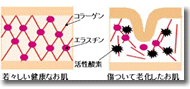 @.体内の健康状態を映し出す鏡であるお肌は、コラーゲン、エラスチンといった繊維で構成されていますが、紫外線や加齢の影響により、硬くなったり切れたりしてしまいます。これがシワ、タルミの原因です。